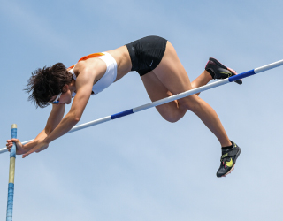 陸上競技の棒高跳を行っています。棒高跳は、1本の棒を使ってどこまで高く跳べるかを競う競技です。