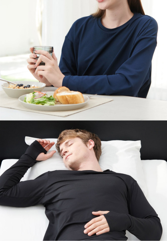 眠る時のウェア選びも、実はとっても重要です。 [エアーリカバリー]は特殊繊維PHTを採用した一般医療機器のウェア(フィット・ドライタイプのみ該当)で、睡眠科学に基づく設計により遠赤外線の血行促進効果が期待され、疲労回復や筋肉のコリの緩和をサポートします。優れたストレッチ性は寝返りを妨げず睡眠の連続性を保ちやすく、夜間覚醒の軽減によって翌朝のパフォーマンス向上に寄与します。