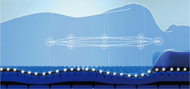 しなやかな素材「フレスフォーム」をトップ層に採用。1680個※の点からなる、表面の凹凸構造が体を受け止め体圧を分散。血行をさまたげにくく、圧迫感を緩和します。新たな「サスペンションスリット」との相乗効果で、やさしい触感のより体にフィットする寝心地に。