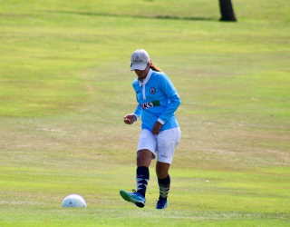 フットゴルフをしています。フットゴルフとはゴルフ場でサッカーボールを使用しカップまでの打数を競います。競技者から子供から大人まで、様々な方が楽しめる競技です。