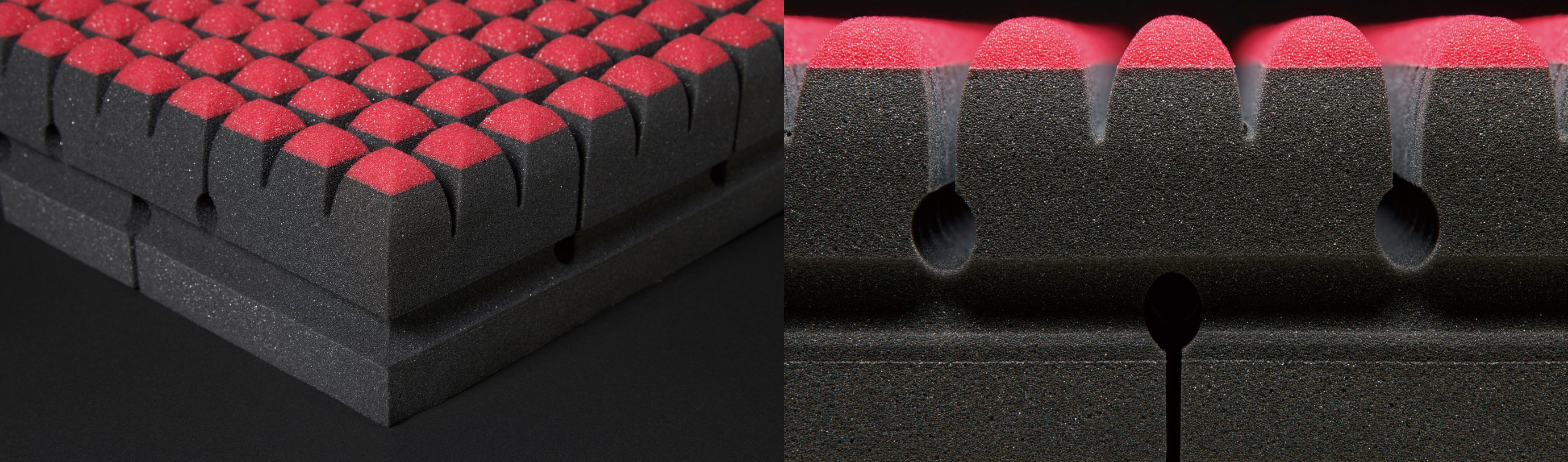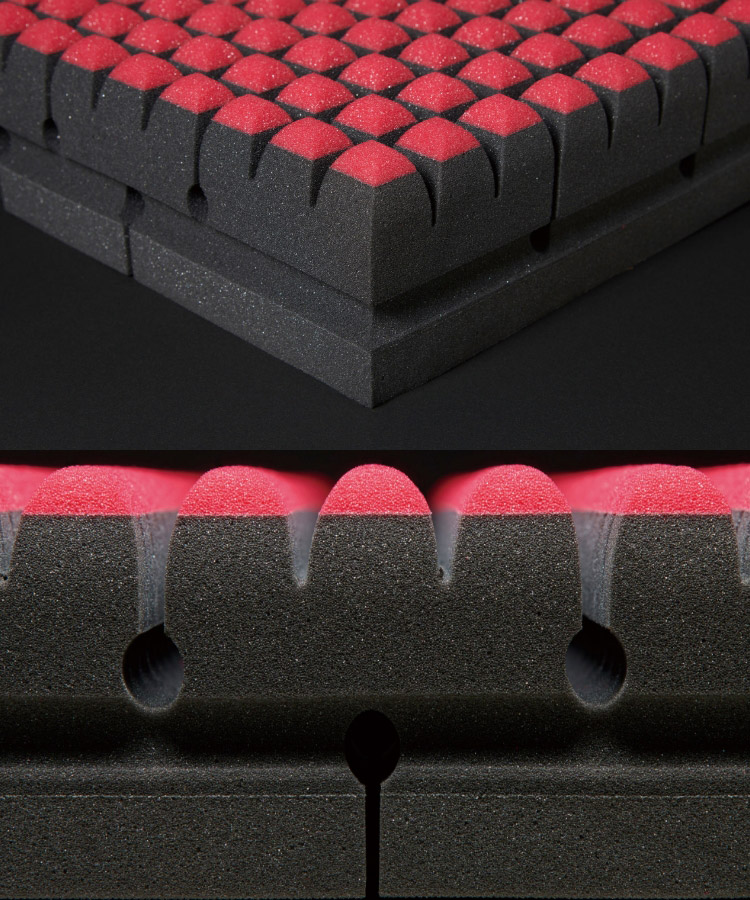 さらに言うと、「点」なら何でもいいというわけではありません。点の突端はウレタンの量も少なくヘタリやすくなりますが、その弱点を補い耐久性を向上させるために、ウレタン自体の素材や成形にもこだわり、積層や計算された特殊立体構造を研究・開発してきました。