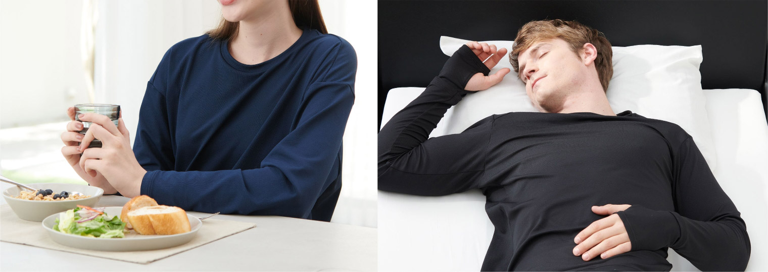 眠る時のウェア選びも、実はとっても重要です。 [エアーリカバリー]は特殊繊維PHTを採用した一般医療機器のウェア(フィット・ドライタイプのみ該当)で、睡眠科学に基づく設計により遠赤外線の血行促進効果が期待され、疲労回復や筋肉のコリの緩和をサポートします。優れたストレッチ性は寝返りを妨げず睡眠の連続性を保ちやすく、夜間覚醒の軽減によって翌朝のパフォーマンス向上に寄与します。